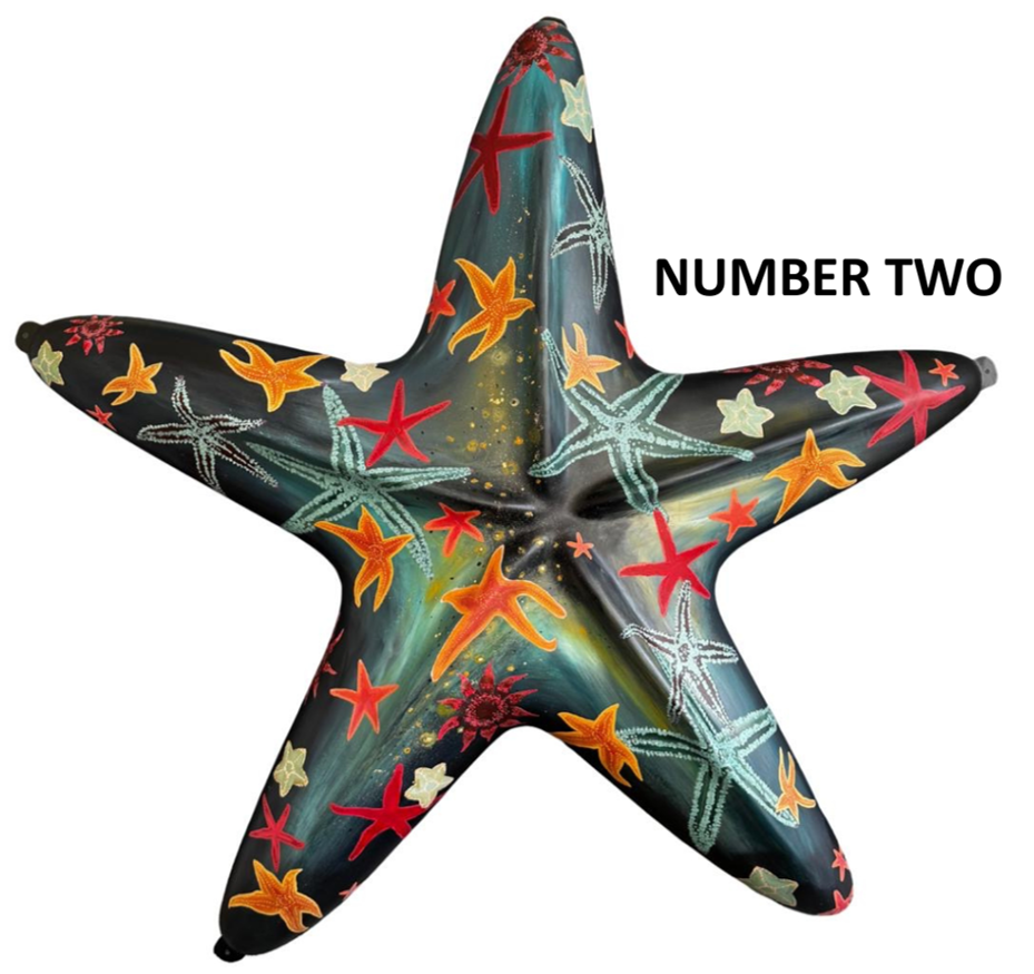 “The background of my design is an amalgamation of the night sky and deep water colours with a sprinkling of the Milky Way. Using the theme of the Starfish (aka Seastars), a ‘galaxy’ of starfish covers the sculpture. My research into starfish found in the UK, led to the discovery of many different kinds of shapes, colours and sizes. I have incorporated some of the individual features of the different species in a more specific way by paintbrush and pens.”